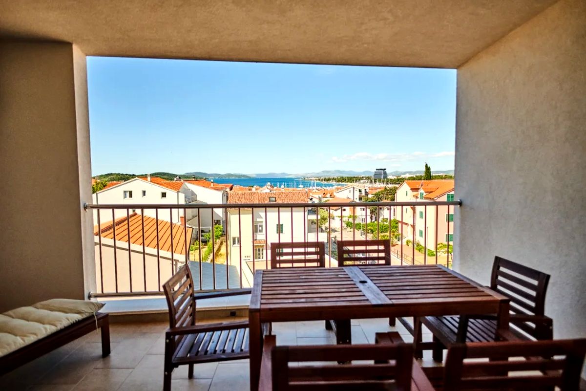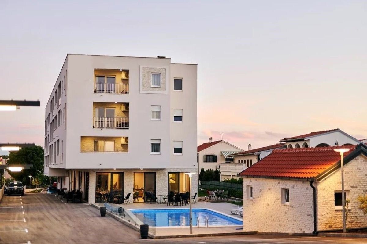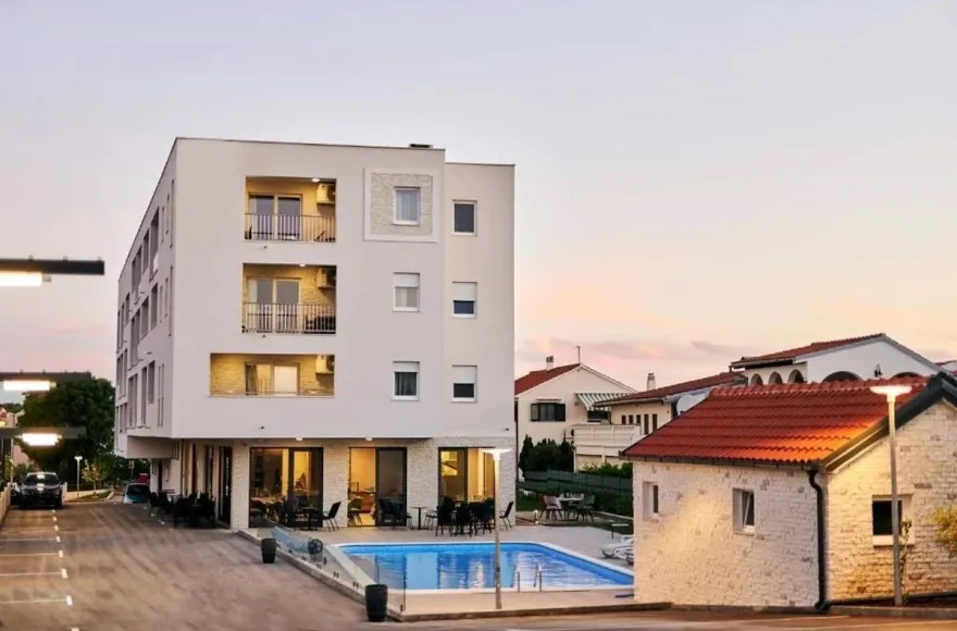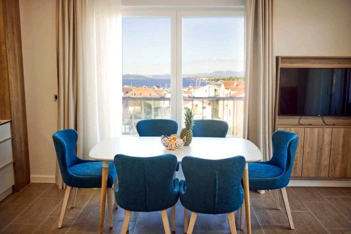 HORVÁT TENGERPARTI APARTMAN VODICE! 400 m-re a tengerparttól 81 nm-es második emeleti apartman (nappali-konyha-étkező, 2 hálószoba, 2 fürdőszoba, terasz kilátással) parkolóhellyel, eladó. Az apartmanok kialakítása, berendezése modern, szállodai színvonalú. Az udvarban medence, az épület földszintjén étterem, bár, edzőterem, valamint wellness is megtalálható a vendégek, tulajdonosok további kényelmére.