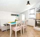 Vodice kedvelt üdülőövezeti részén, mindössze 180 méterre a strandtól! Eladó egy teljesen berendezett, első emeleti (tetőtér) 53 m²-es két hálószobás lakás egy kis lakóház magas tetőterében. A lakás keleti fekvésű, ami sok reggeli napfényt és kellemes hangulatot biztosít napközben is. A nappali egy légterű a konyhával és az étkezővel, ahonnan egy tágas teraszra lehet kijutni. A lakásban két hálószoba és egy fürdőszoba található. A lakás teljesen felszerelt és bútorozott, a bútorokkal és felszereléssel eladó, ami lehetővé teszi az azonnali beköltözést további beruházások nélkül. Légkondicionálóval (fűtés/hűtés) felszerelt, és parkolóhellyel is rendelkezik. Az épület szépen karbantartott, és a helyszín rendkívül vonzó – Vodice csendes részén található, ideális családi nyaraláshoz vagy turisztikai bérléshez. A strand mindössze 180 méterre, a városközpont pedig 500 méterre található. A tengerhez való közelsége miatt, jól karbantartott és teljesen felszerelt, ez a lakás kiváló lehetőséget kínál a kényelmes lakhatásra vagy a turisztikai befektetésre.