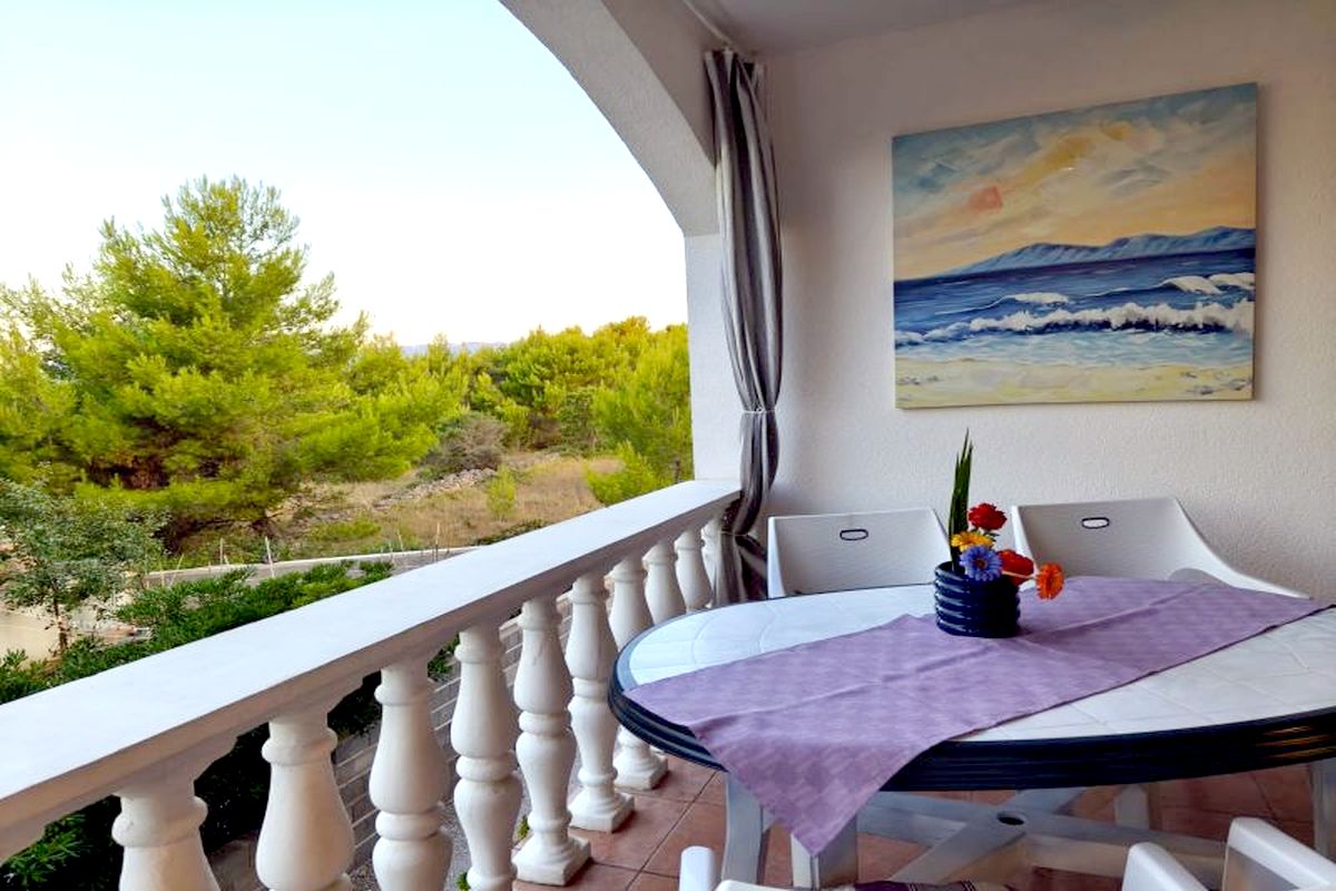 Az első emeleti lakás modern elrendezésű: tágas nappali-konyha-étkező, két hálószoba, fürdőszoba-WC, valamint egy hangulatos terasz tartozik hozzá, ahol élvezheti a dalmát naplementét.