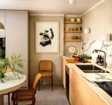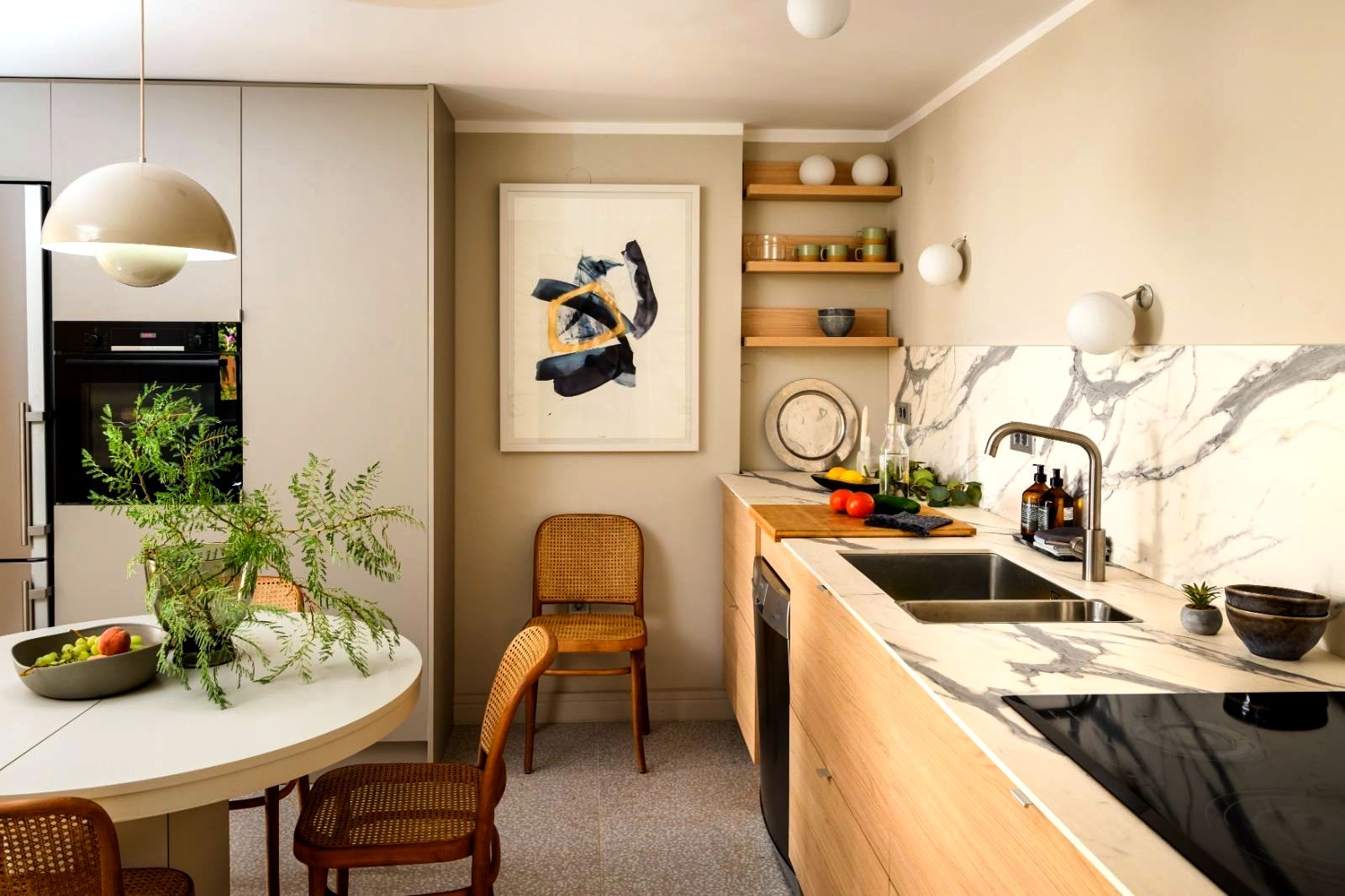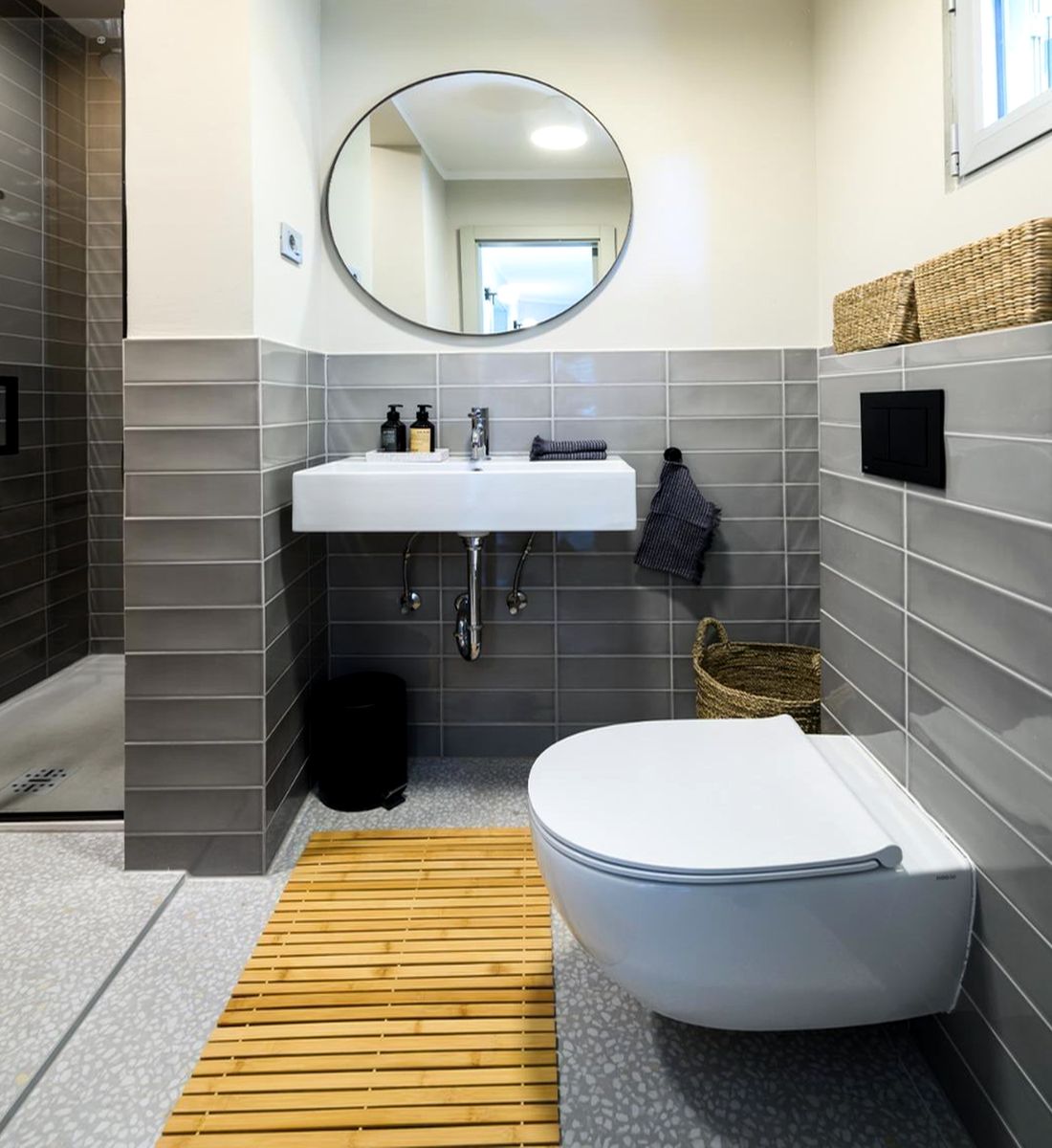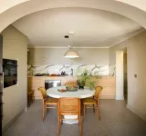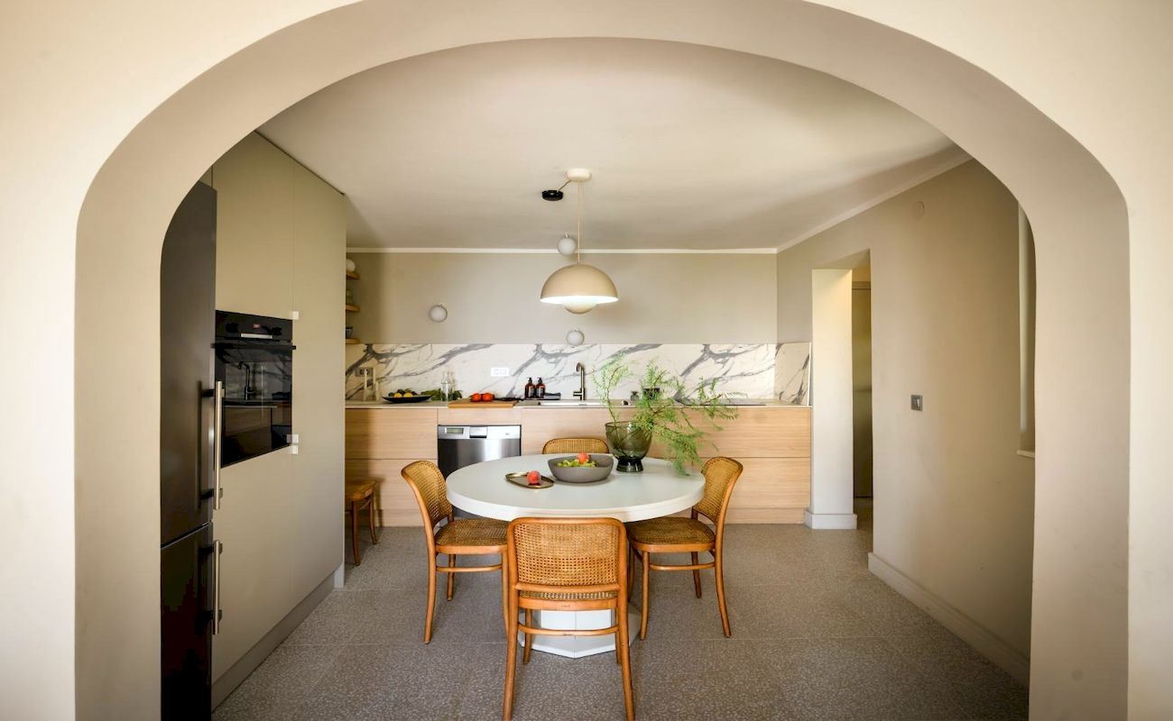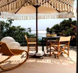 A földszinten egy felújított, világos nappali, konyha és étkező található. A konyha modern kialakítású, ugyanakkor harmonikusan illeszkedik a ház hangulatához. A nappaliból közvetlen kijárat nyílik egy félig fedett teraszra, ahonnan szép tengeri panoráma tárul elénk. Ezen a szinten található az egyik fürdőszoba is, beépített zuhanyzóval.