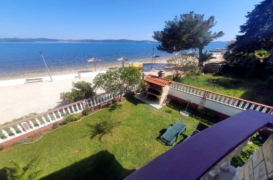 ELADÓ HORVÁT TENGERPARTI INGATLAN! ZADAR közelében panorámás, a tengertől az első sorban, kétszintes, 190 nm-es 2 apartmanos ( I. apartman  fsz. -nappali-konyha-étkező, fürdőszoba-WC, terasz; em. -3 hálószoba, fürdőszoba-WC, panorámás terasz; II. apartman,  -nappali-konyha-étkező, 2 hálószoba, fürdőszoba-WC, terasz) ház a tengertől 80 m-re, 420 nm-es telken, garázzsal, parkolóval eladó.