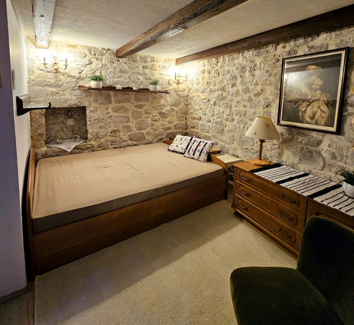 ELADÓ HORVÁT TENGERPARTI INGATLAN! VODICE közelében, a tengertől 70 m-re, három szintes, 42 nm-es, kőház, 70 m-re a tengertől eladó. A légkondicionált ingatlan felosztása: fsz. -nappali-konyha-étkező; első emelet: kényelmes hálószoba, fürdőszoba-WC; második emelet: hálószoba, WC-mosdó. Az ingatlan exkluzivitását adja a tengerpart közeli, ódon középkort idéző környező házak. Az épület közelében minden igény szerint elérhető (pékségek, vendéglők, kávézók, élelmiszer üzletek).