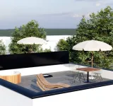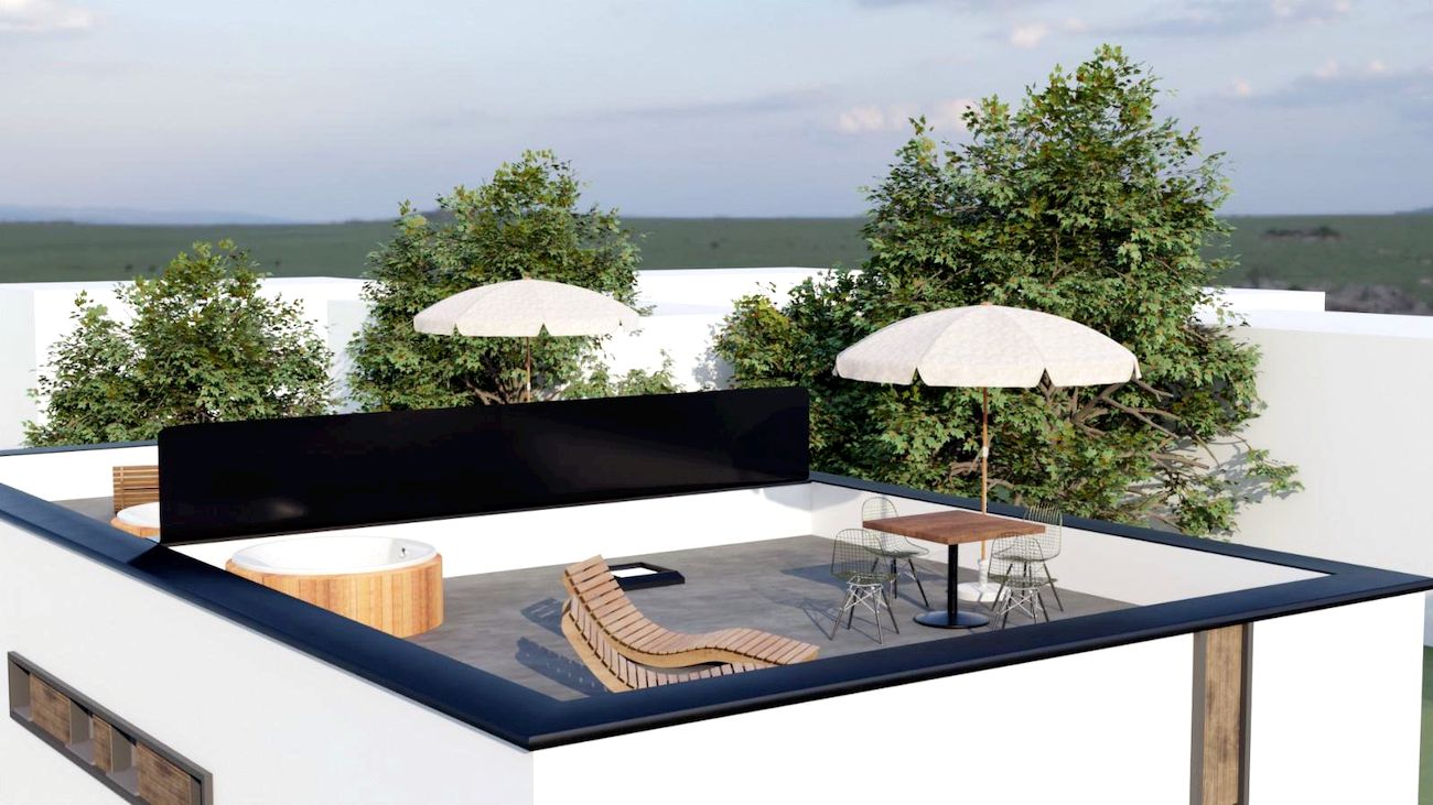 Az ingatlan lapostetős kialakítása lehetővé teszi egy 40 m²-es tetőterasz kialakítását, amely tovább növeli a ház értékét, élményfaktorát és kiadhatóságát.