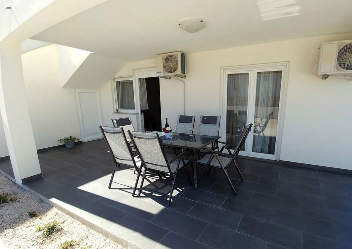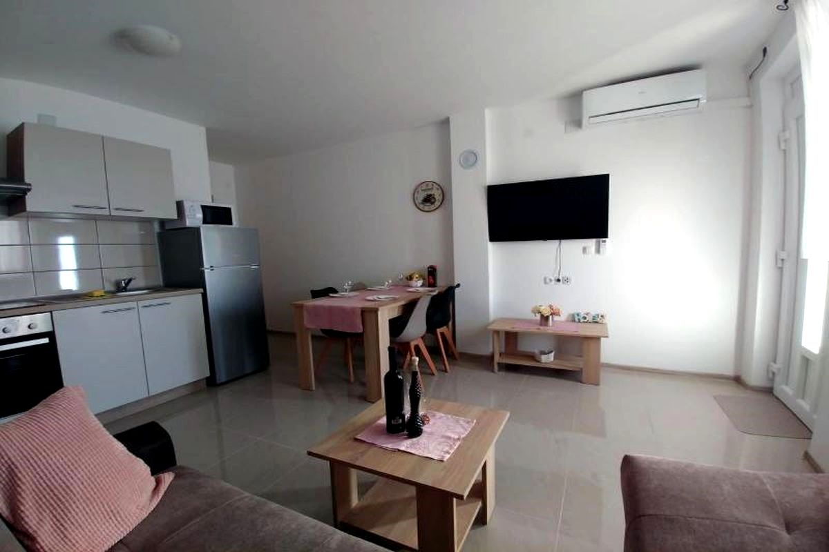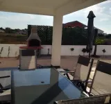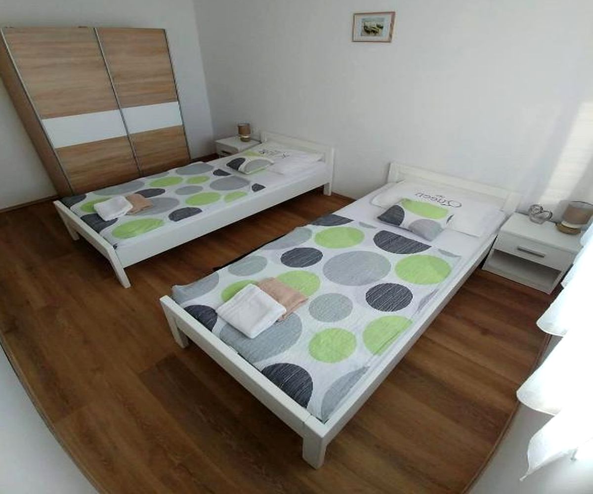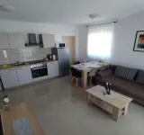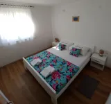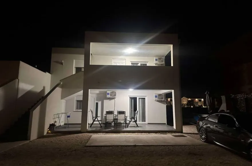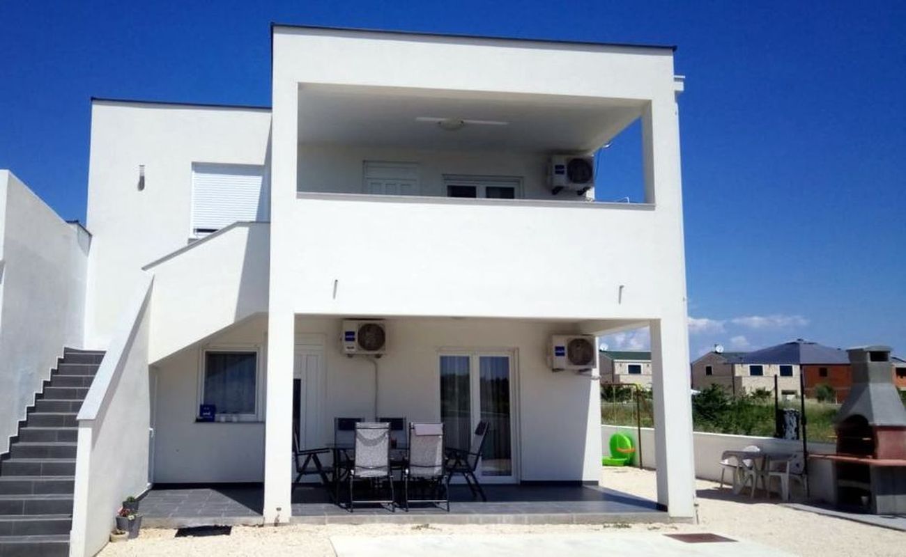 ELADÓ HORVÁT INGATLAN! ZADAR közelében, a tengertől 280 m-re, kétszintes, 120 nm-es, iker jellegű (saját Hrsz.) 3 apartmanos (Fsz.: 2db  apartman -nappali-konyha-étkező, 1 hálószoba, fürdőszob-WC, terasz; em.: nappali-konyha-étkező, ) ház 180 nm-es telken eladó.