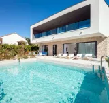 HORVÁT TENGERPARTI VILLA ELADÓ! PRIMOSTEN közelében ROGOZNICÁBAN, a tengertől 30 m-re 220 nm-es panorámás kétszintes villa (Földszint:  -nappali-konyha-étkező, mosdó-WC,, terasz, 40 nm-es medence; em.:  4 hálószoba, mindegyikhez saját fürdőszoba-WC, és terasz) 400 -nm-es telken eladó.